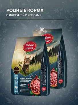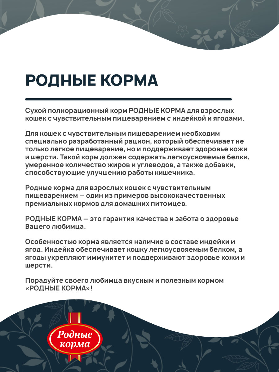 Сухой полнорационный корм РОДНЫЕ КОРМА для взрослых кошек с чувствительным пищеварением с индейкой и ягодами.