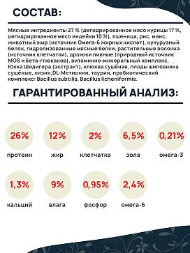 Мясные ингредиенты 27 % (дегидрированное мясо курицы 17 %, дегидрированное мясо индейки 10 %), пшеница, рис, маис, животный жир (источник Омега-6 жирных кислот), кукурузный белок, гидролизованные мясные белки, растительные волокна (источник клетчатки), дрожжи пивные (природный источник MOS и бета-глюканов), витаминно-минеральный комплекс, Юкка Шидигера (экстракт), клюква сушёная, плоды шиповника сушёные, лизин,DL-Метионин, таурин, пробиотический комплекс: Bacillus subtilis, Bacillus licheniformis.