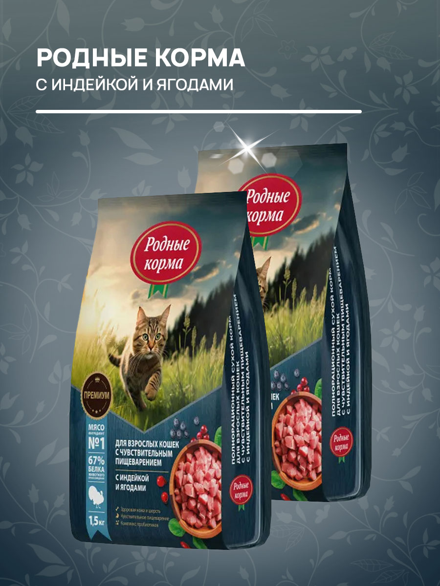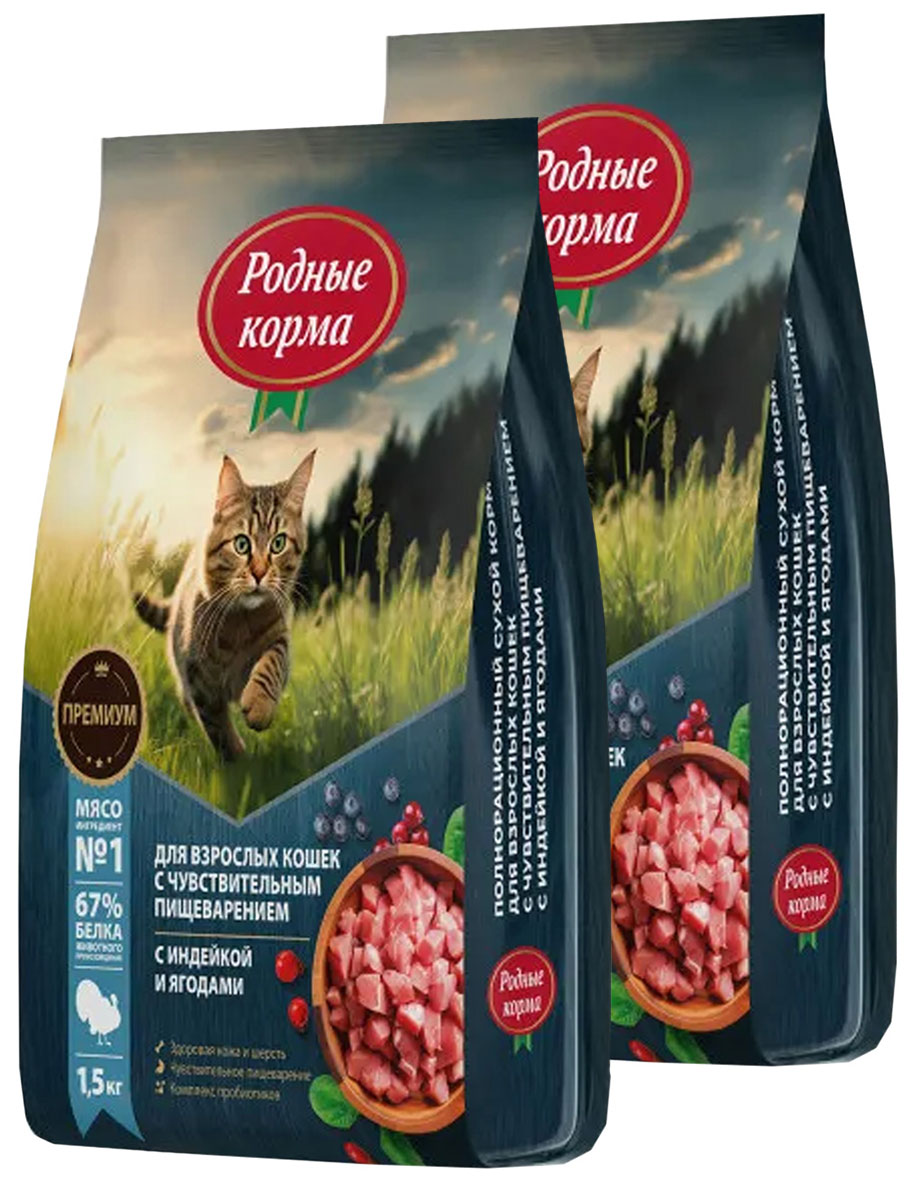 Сухой корм для кошек РОДНЫЕ КОРМА с чувствительным пищеварением индейка, ягоды (1,5 + 1,5 кг)