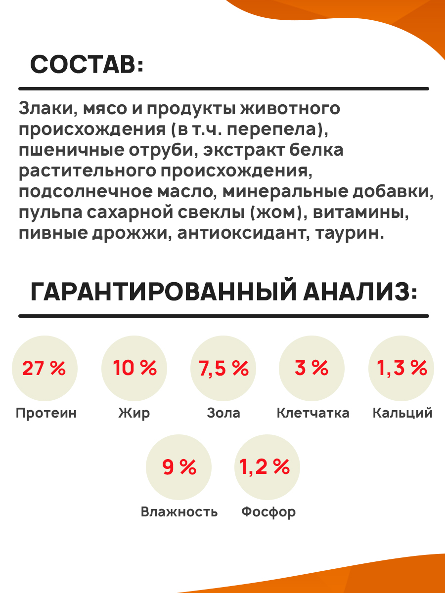 Злаки, мясо и продукты животного происхождения (в т.ч. перепела), пшеничные