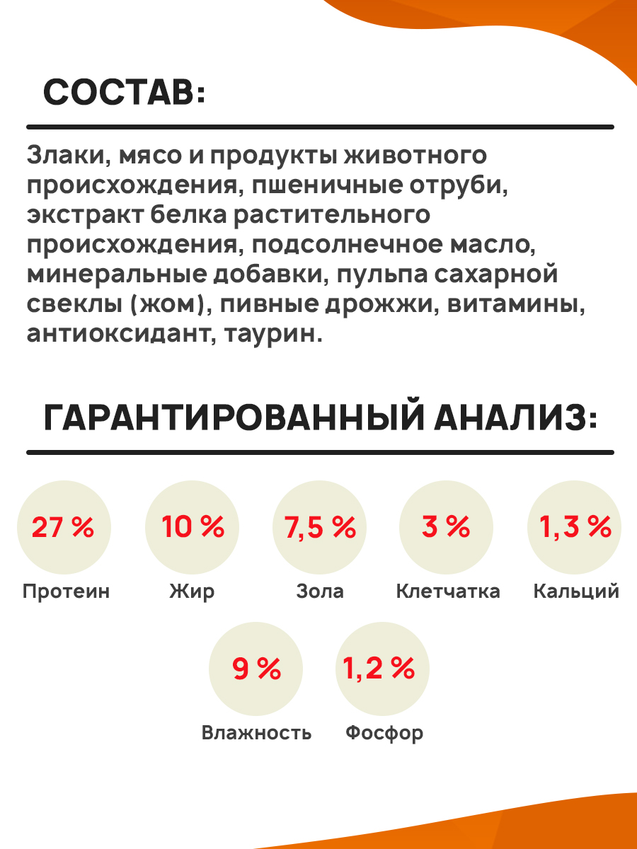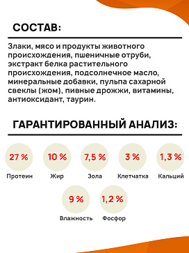 пульпа сахарной свеклы (жом), пивные дрожжи, витамины, антиоксидант, таурин.