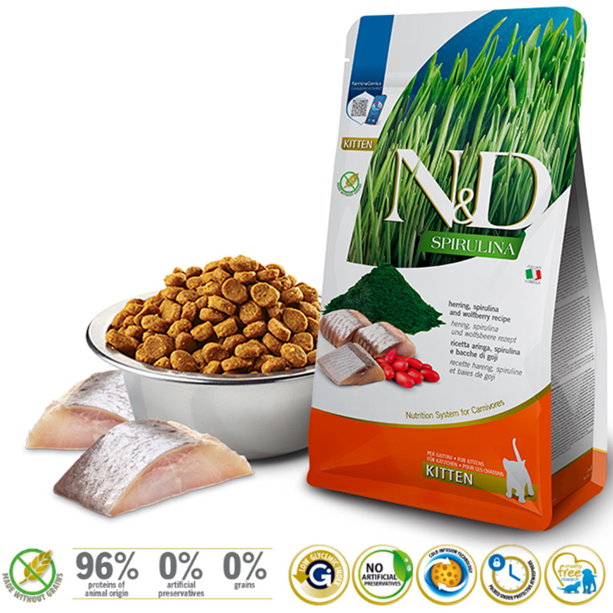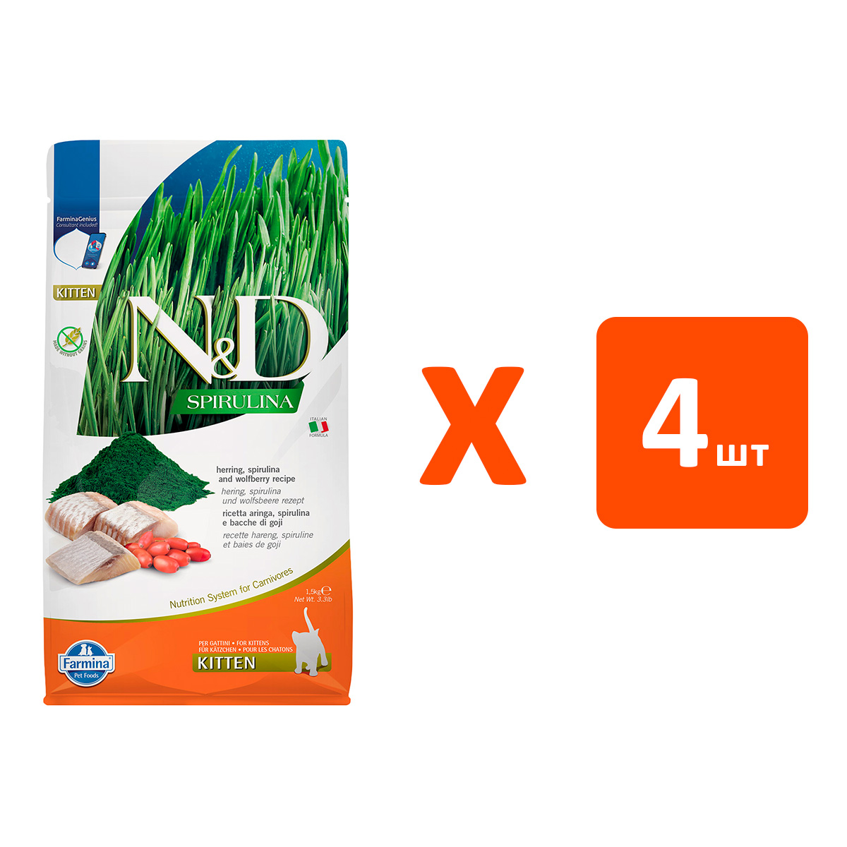 Сухой корм для котят FARMINA N&D GRAIN FREE SPIRULINA KITTEN беззерновой сельдь, ягоды годжи, спирулина (1,5 кг х 4 шт)