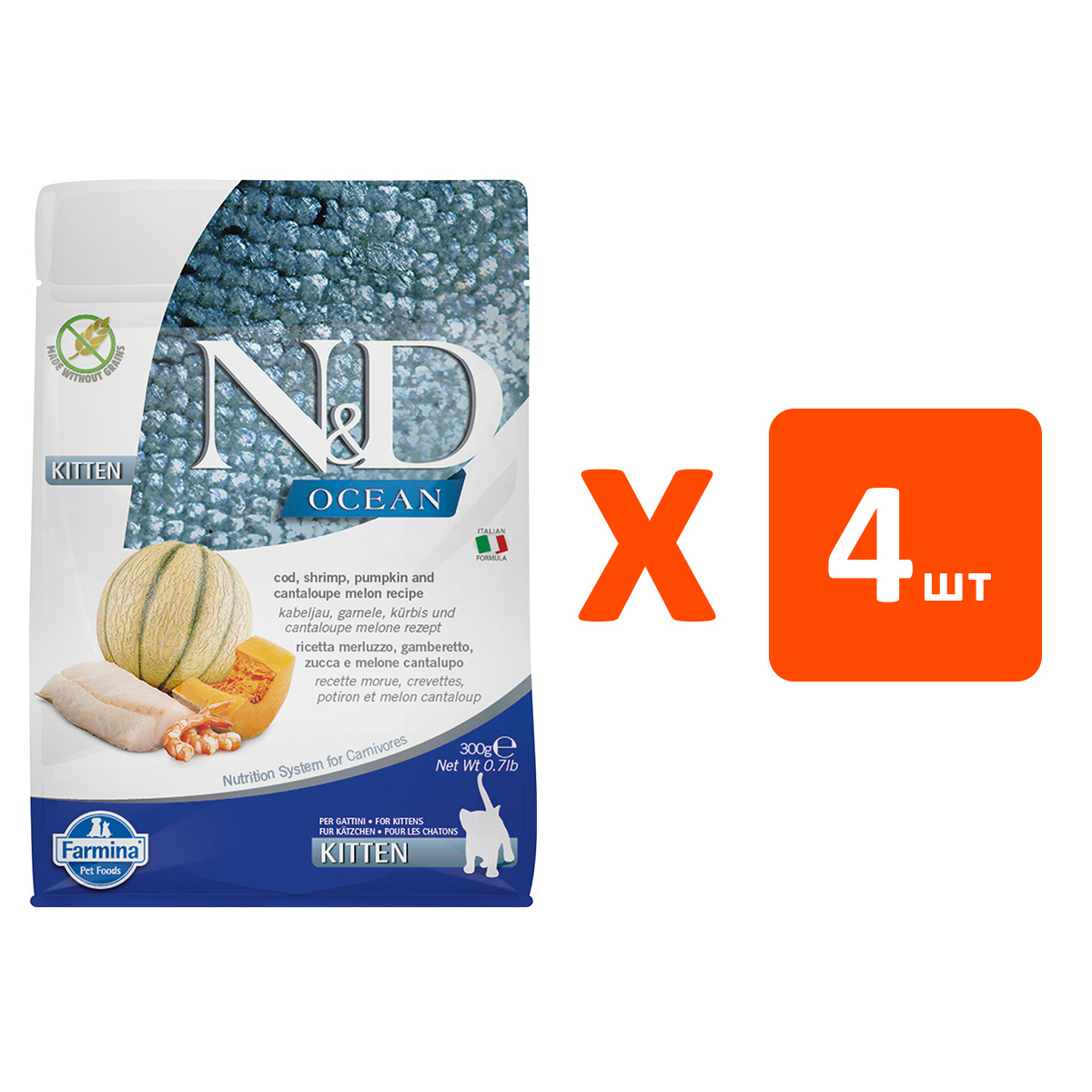 Сухой корм для котят FARMINA N&D OCEAN KITTEN беззерновой треска, креветки, тыква, дыня (0,3 кг х 4 шт)