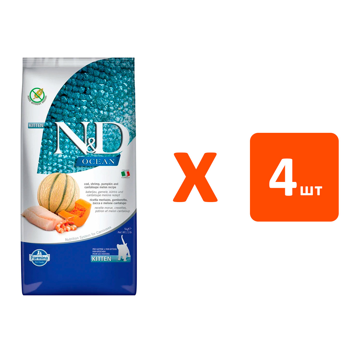 Сухой корм для котят FARMINA N&D OCEAN KITTEN беззерновой треска, креветки, тыква, дыня (5 кг х 4 шт)