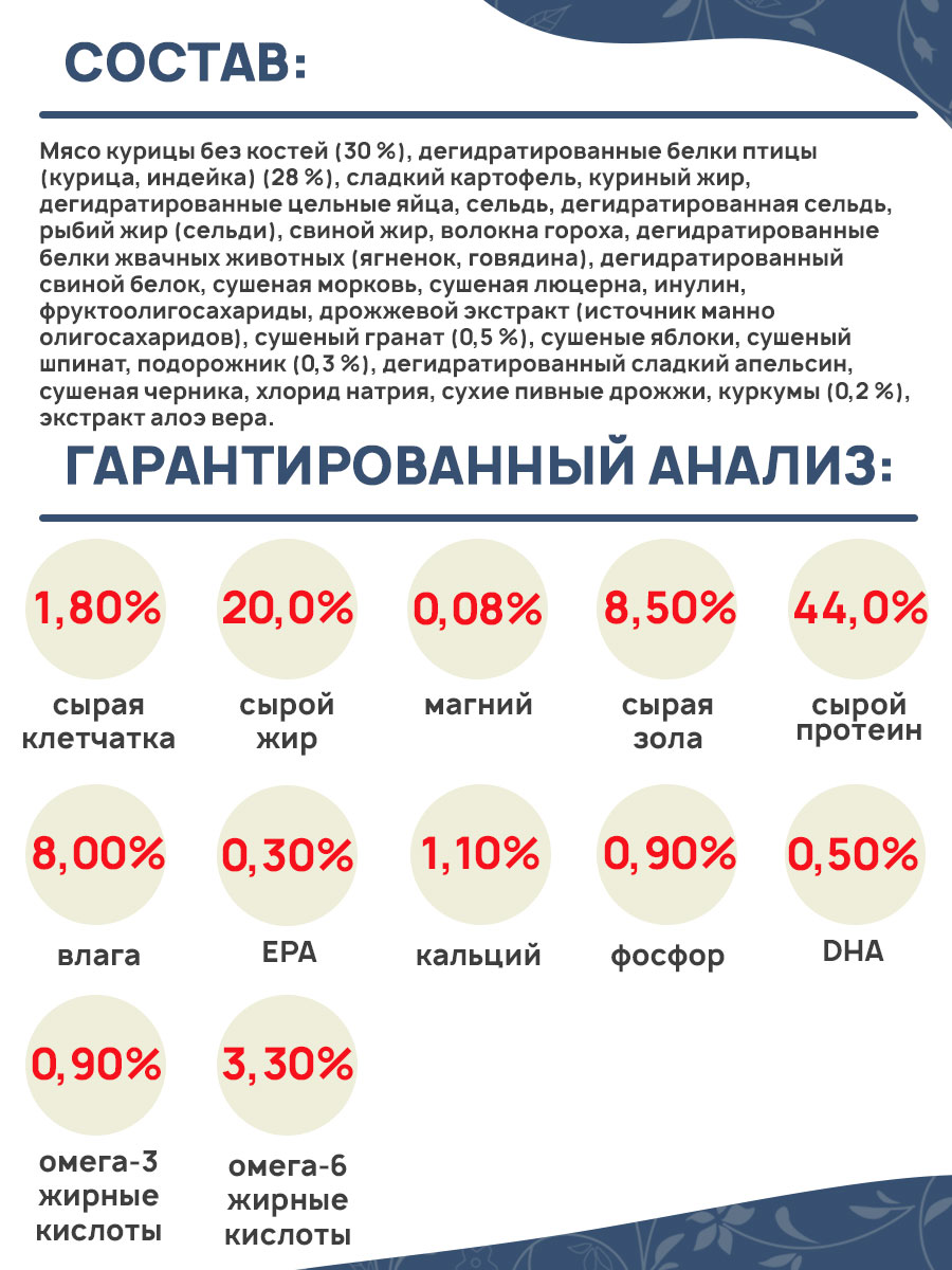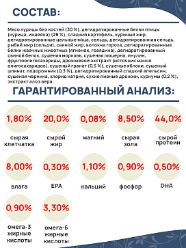 Мясо курицы без костей (30 %), дегидратированные белки птицы (курица, индейка) (28 %), сладкий картофель, куриный жир, дегидратированные цельные яйца, сельдь, дегидратированная сельдь, рыбий жир (сельди), свиной жир, волокна гороха, дегидратированные белки жвачных животных (ягненок, говядина), дегидратированный свиной белок, сушеная морковь, сушеная люцерна, инулин, фруктоолигосахариды, дрожжевой экстракт (источник маннoолигосахаридов), сушеный гранат (0,5 %), сушеные яблоки, сушеный шпинат, подорожник (0,3 %), дегидратированный сладкий апельсин, сушеная черника, хлорид натрия, сухие пивные дрожжи, куркумы (0,2 %), экстракт алоэ вера.