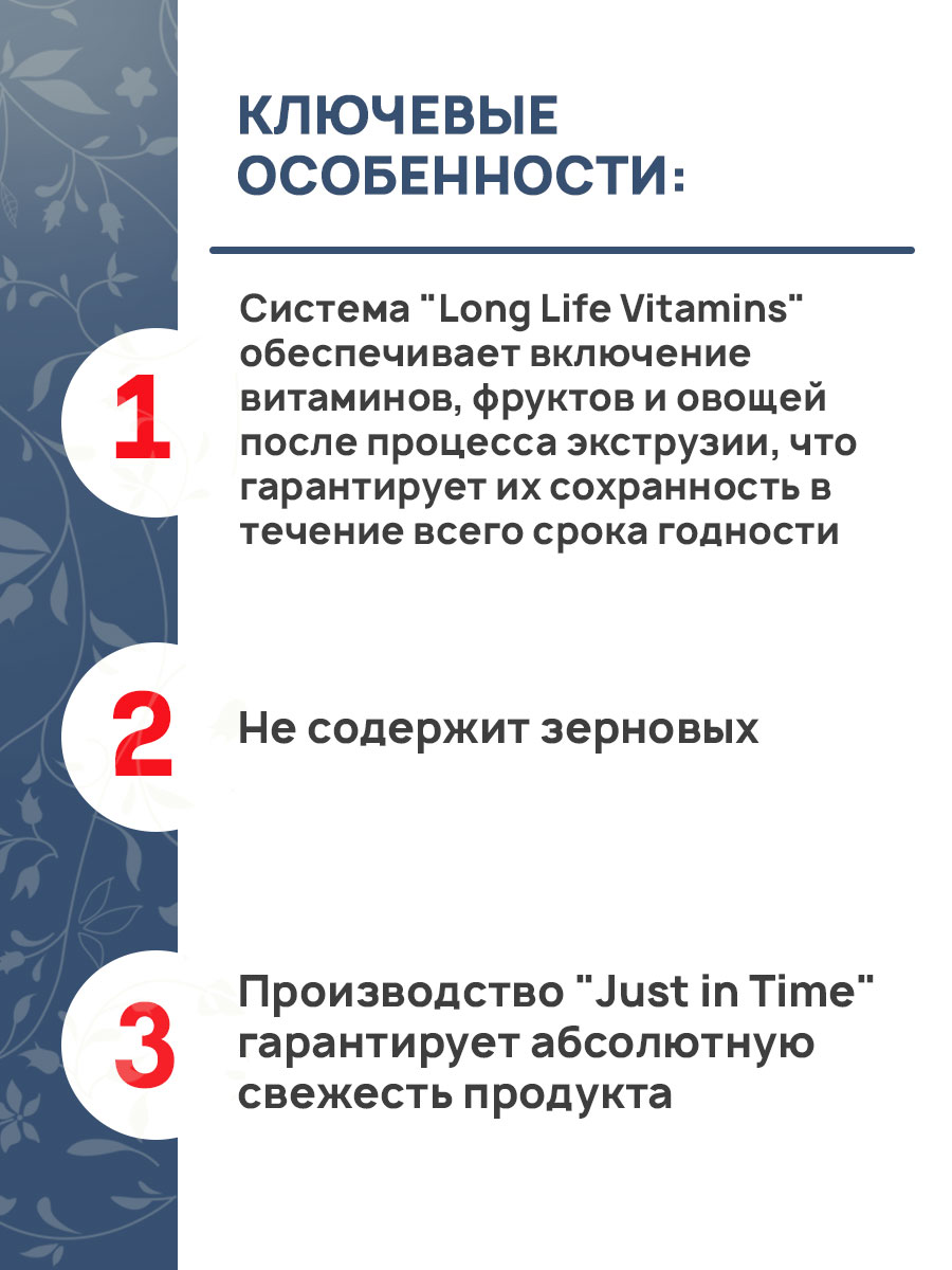 Высокое содержание белков животного происхождения (70 %), оптимальный баланс витаминов и минеральных веществ, источником которых служат свежие фрукты и овощи, содержание лекарственных растений для поддержания здоровья и улучшения качества жизни, легко усваиваемые жиры животного происхождения, картофель в качестве источников углеводов, беззерновой состав корма – вот идеальная формула, которая обеспечит Вашему питомцу долгую, здоровую и активную жизнь!