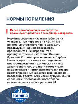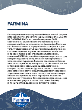 FARMINA CAT N&D PRIME – это линейка кормов с 98 % содержанием белка животного происхождения, которая наиболее соответствует философии Системы Питания Плотоядных.