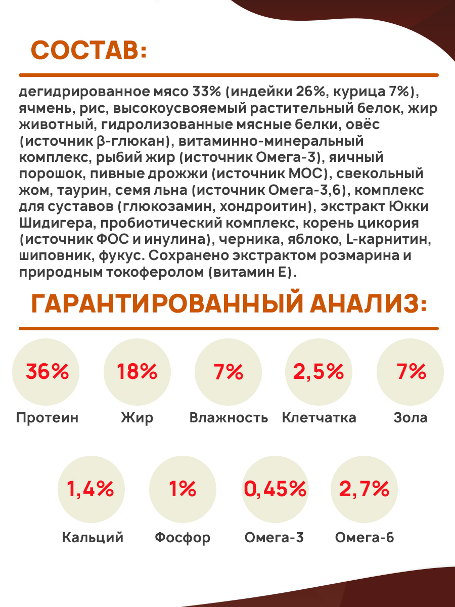 Состав: дегидрированное мясо 33% (индейки 26%, курица 7%), ячмень, рис, высокоусвояемый растительный белок, жир животный, гидролизованные мясные белки, овёс (источник β-глюкан), витаминно-минеральный комплекс, рыбий жир (источник Омега-3), яичный порошок, пивные дрожжи (источник МОС), свекольный жом, таурин, семя льна (источник Омега-3,6), комплекс для суставов (глюкозамин, хондроитин), экстракт Юкки Шидигера, пробиотический комплекс, корень цикория (источник ФОС и инулина), черника, яблоко, L-карнитин, шиповник, фукус. Сохранено экстрактом розмарина и природным токоферолом (витамин Е).