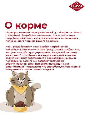 Монопротеиновый полнорационный сухой корм для котят c индейкой. Разработан специально для повышенных потребностей котят и является идеальным выбором для полноценного питания вашего любимца.