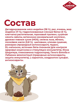 Дегидрированное мясо индейки (38 %), рис, ячмень, жир индейки (11 %), гидролизованные мясные белки (5 %), клетчатка растительная, гороховый протеин, сушёная мякоть свёклы, витаминно-минеральный комплекс, дрожжи пивные сухие (MOS), семена льна, яблоко, лососёвое масло (0,8 %), шиповник, клюква сушеная, розмарин (природный антиоксидант), таурин, DL-метионин, источник бета-глюканов (для контроля здоровья кишечника и стимуляции иммунитета), Юкка Шидигера, глюкозамина гидрохлорид, Гинкго Билоба и Лабазник вязолистный (природные антиоксиданты, защита иммунитета), L-карнитин, хондроитин сульфат, антиоксиданты.