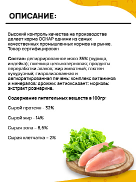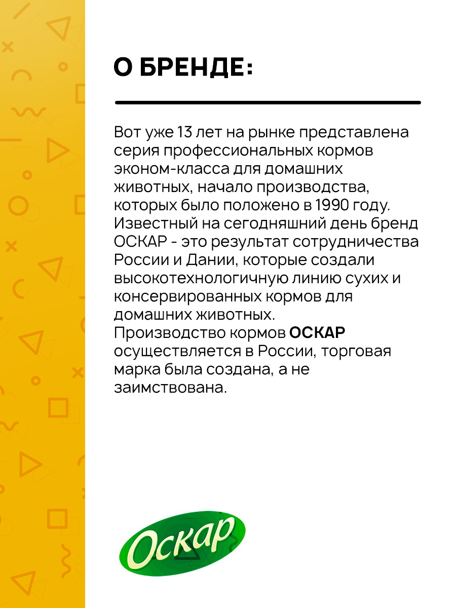 Высокий контроль качества на производстве делает корма ОСКАР одними из самых качественных промышленных кормов на рынке. Товар сертифицирован.