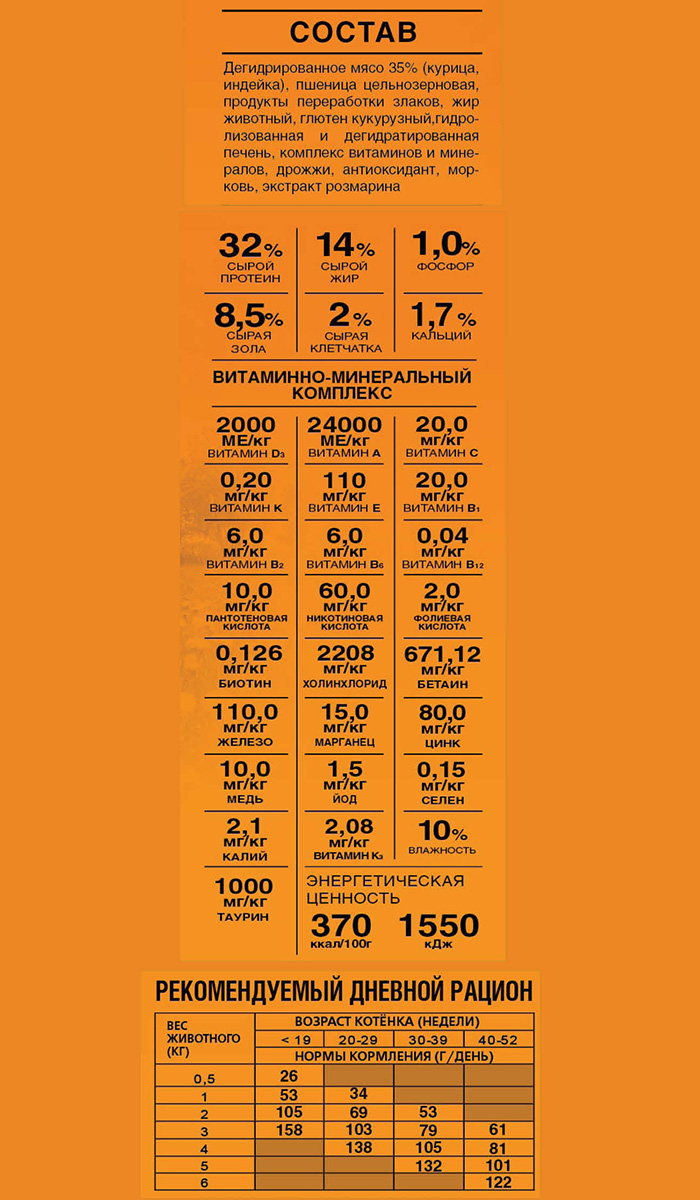 Состав: дегидрированное мясо 35% (курица, индейка); пшеница цельнозерновая; продукты переработки злаков; жир животный; глютен кукурузный; гидролизованная и дегидратированная печень; комплекс витаминов и минералов; дрожжи; антиоксидант; морковь; экстракт розмарина.