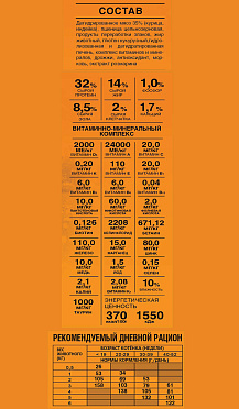 Минеральные вещества: Витамин D3 - 2000 МЕ/кг; Витамин А – 24 000 МЕ/кг; Витамин Е - 110 мг/кг; Витамин С - 20 мг/кг; Витамин К – 0,2 мг/кг; Витамин В1 -20 мг/кг; Витамин В2 - 6 мг/кг; Витамин В6 - 6 мг/кг; Витамин В12 - 0,04 мг/кг; Пантотеновая кислота - 10 мг/кг; Никотиновая кислота - 60 мг/кг; Фолиевая кислота - 2 мг/кг; фосфор – 1,2%; кальций – 1,7%; биотин – 0,126 мг/кг; холинхлорид - 2208 мг/кг; бетаин – 671,12 мг/кг; железо - 110 мг/кг; марганец – 15 мг/кг; цинк – 80 мг/кг; медь – 10 мг/кг; йод – 1,5 мг/кг; селен – 0,15 мг/кг; калий – 2,1 мг/кг; таурин - 1000 мг/кг.