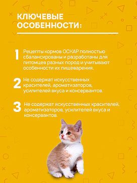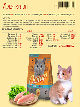 Сухой корм премиум класса ОСКАР для котят – это высококачественный полнорационный корм, который вобрал в себя новейшие разработки российских производителей, специалистов в пищевой промышленности для животных и профессиональных заводчиков.