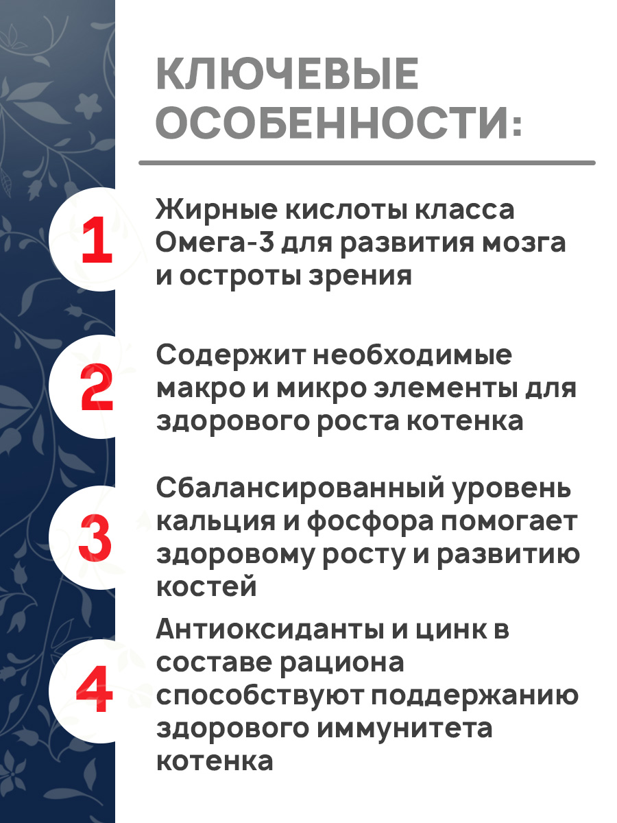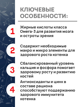 - Содержит необходимые макро и микро элементы для здорового роста котенка.