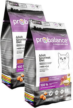 Сухой корм PROBALANCE GOURMET DIET предназначен для ежедневного кормления взрослых кошек с привередливыми вкусовыми пристрастиями. Также корм подойдет для кошек с аллергией на куриное мясо