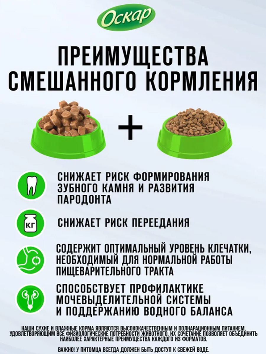 Ежедневное присутствие корма ОСКАР в рационе животного сохранит здоровье, укрепит иммунитет и поддержит хорошее настроение на долгое время.