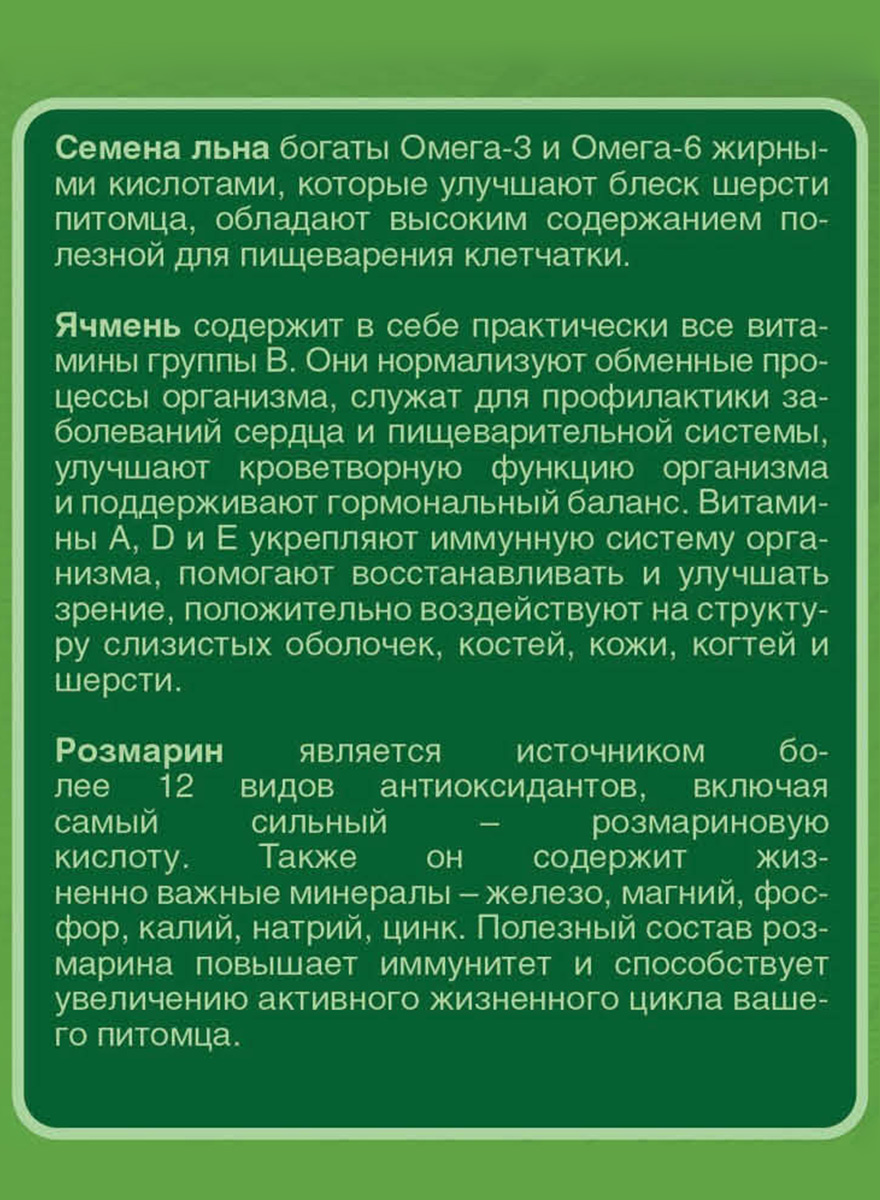 Протеины, содержащиеся в корме, легко усваиваются, содержат большое количество жизненно важных аминокислот, снабжают энергией, необходимой для роста мышц и тканей.