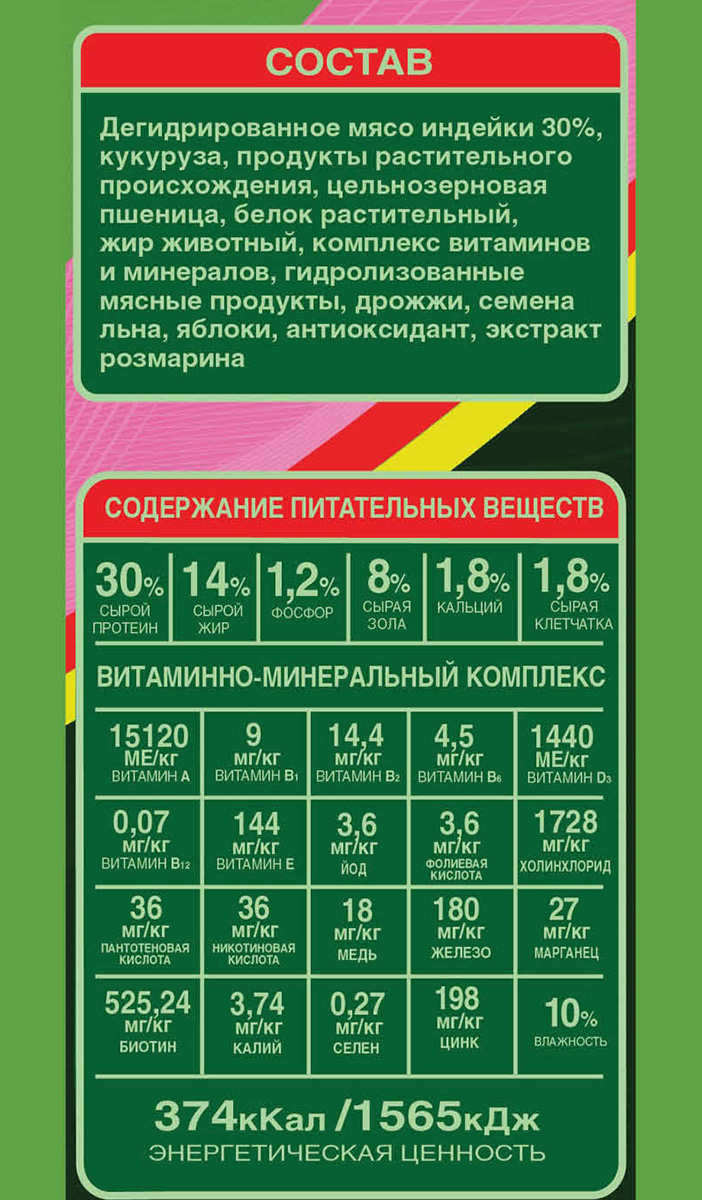 Мясо индейки дегидрированное 30%, кукуруза, продукты растительного происхождения, цельнозерновая пшеница, белок растительный, жир животный, комплекс витаминов и минералов, гидролизованные мясные продукты, дрожжи, семена льна, яблоки, антиоксидант, экстракт розмарина
