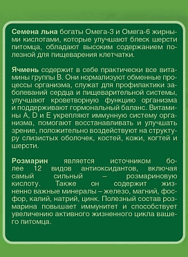 В основе рациона — натуральные полезные продукты: мясо и субпродукты, богатые белками и аминокислотами, злаки, насыщенные клетчаткой, а также масла, которые будут снабжать организм ценными жирными кислотами.