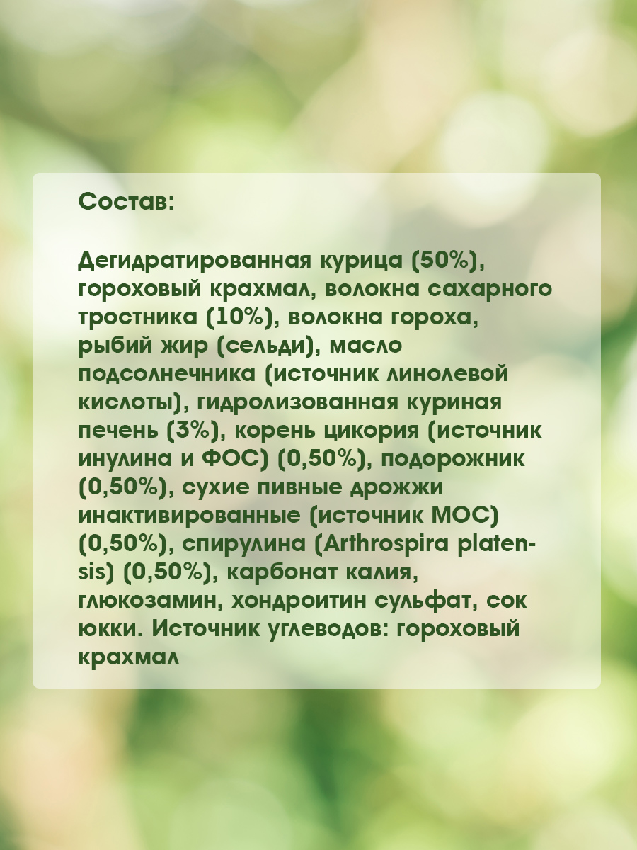 Дегидратированная курица (50%), гороховый крахмал, волокна сахарного тростника (10%), волокна гороха, рыбий жир (сельди), масло подсолнечника (источник линолевой кислоты), гидролизованная куриная печень (3%), корень цикория (источник инулина и ФОС) (0,50%), подорожник (0,50%), сухие пивные дрожжи инактивированные (источник МОС) (0,50%), спирулина (Arthrospira platensis) (0,50%), карбонат калия, глюкозамин, хондроитин сульфат, сок юкки. Источник углеводов: гороховый крахмал.