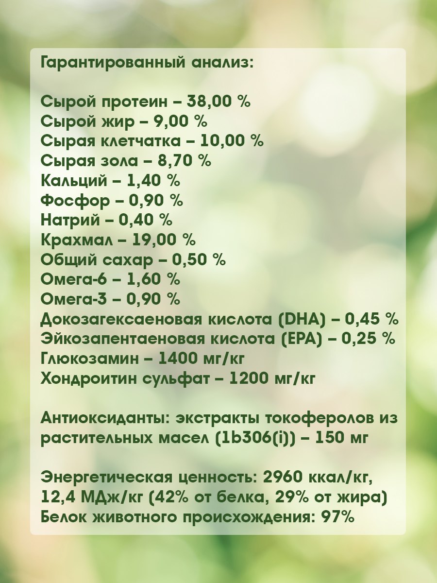 Энергетическая ценность: 2960 ккал/кг, 12,4 МДж/кг (42% от белка, 29% от жира). Белок животного происхождения: 97%.