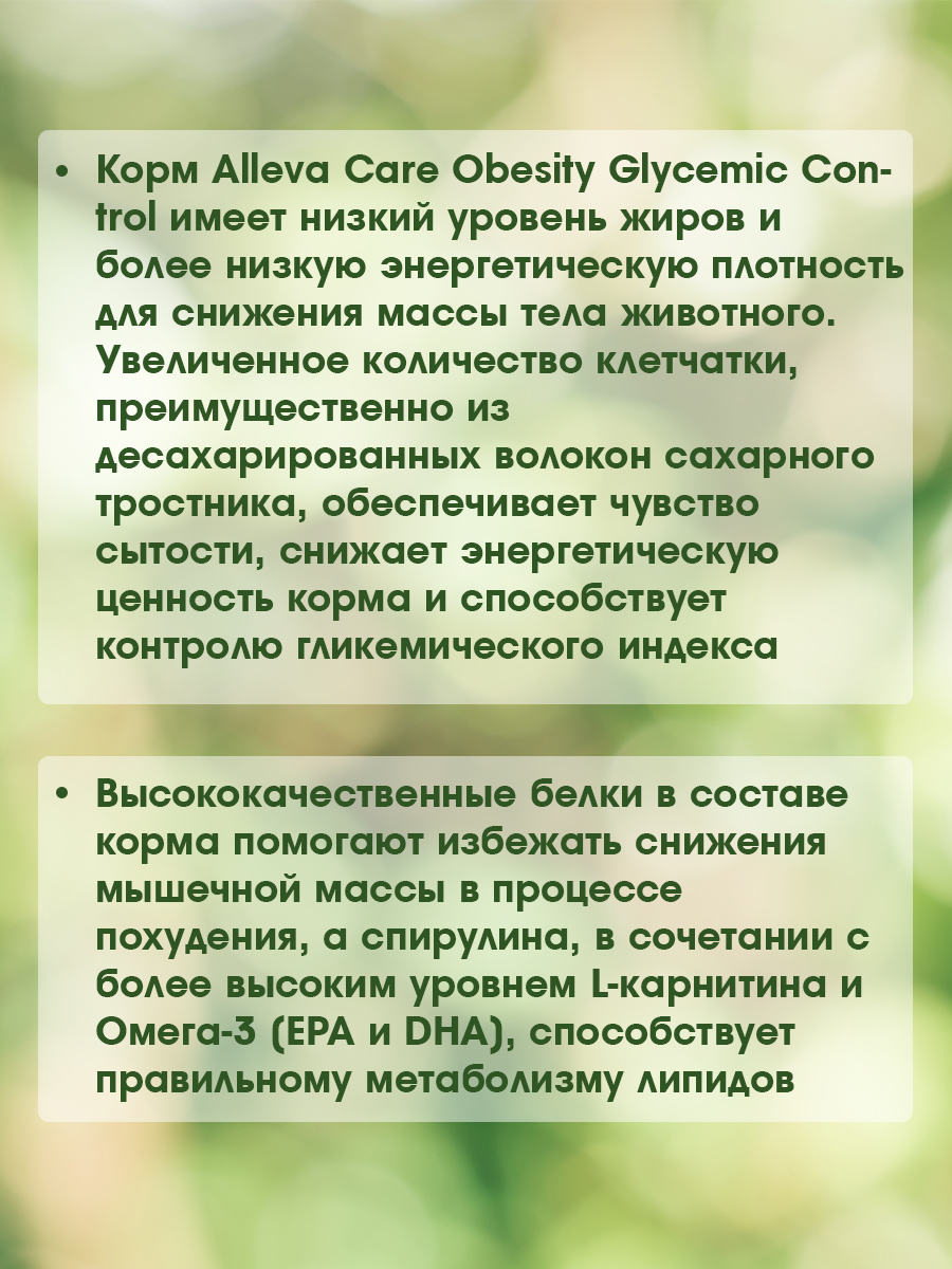 Корм Alleva Care Obesity Glaycemic Control имеет низкий уровень жиров и более низкую энергетическую плотность для снижения массы тела животного.