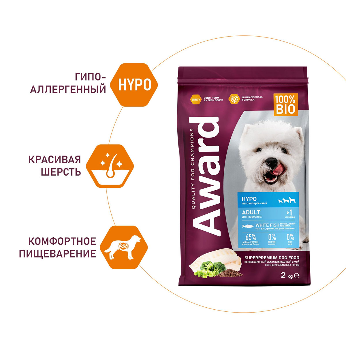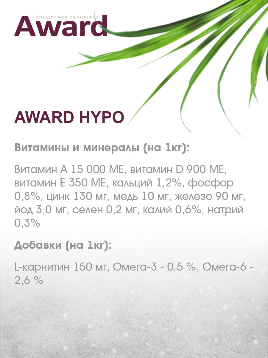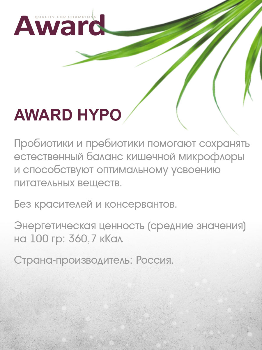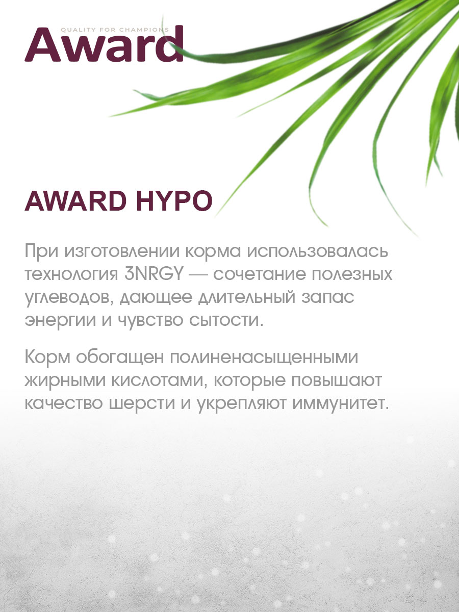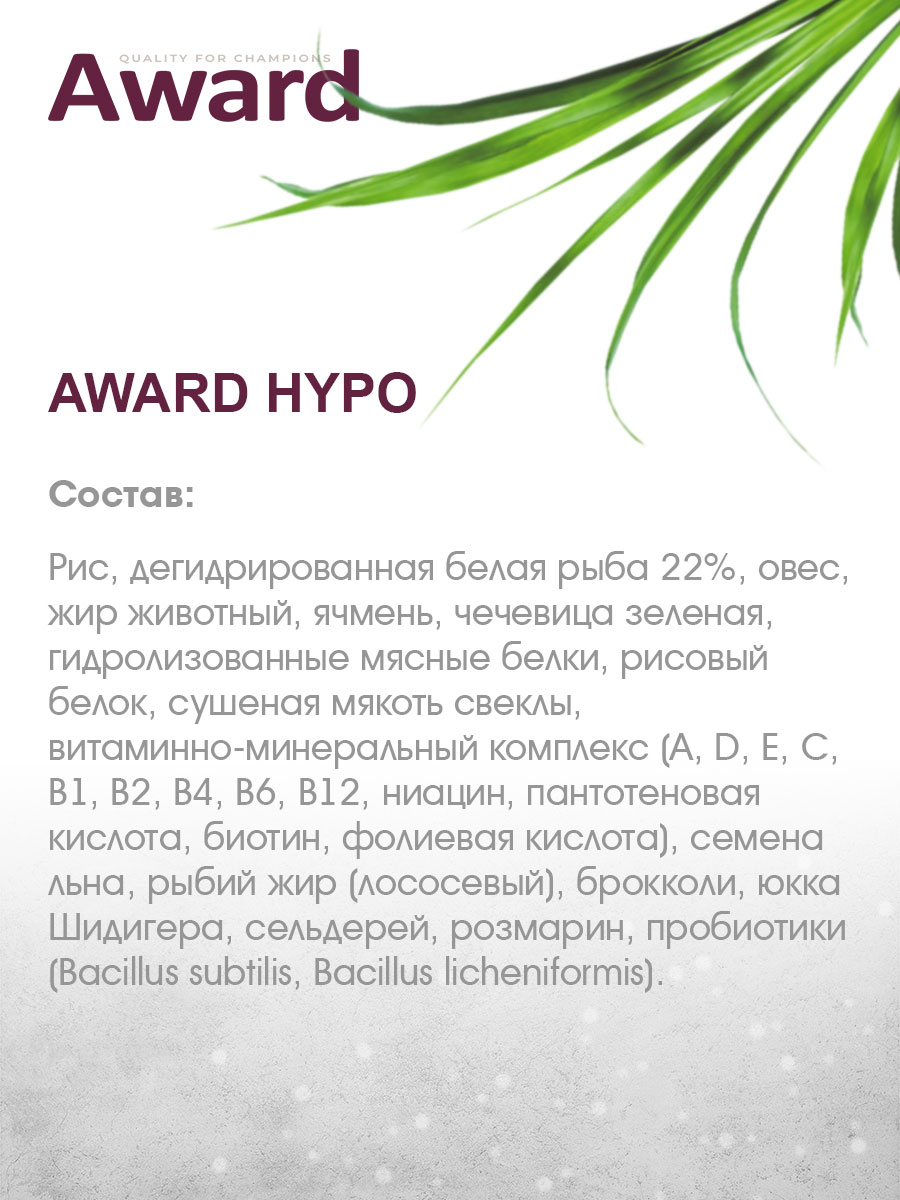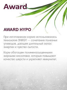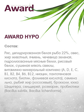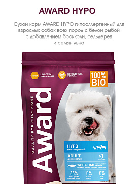 Сухой корм AWARD HYPO гипоаллергенный для взрослых собак всех пород с белой рыбой с добавлением брокколи, сельдерея и семян льна.