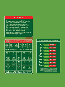 Состав: мясо дегидрированное 30 % (индейка, утка), цельнозерновая пшеница, кукуруза, продукты растительного происхождения, жир животный, рис, комплекс витаминов и минералов, дрожжи, гидролизованные мясные продукты, жир рыбий, яблоки, антиоксидант, комплекс пробиотиков, тыква, экстракт розмарина.