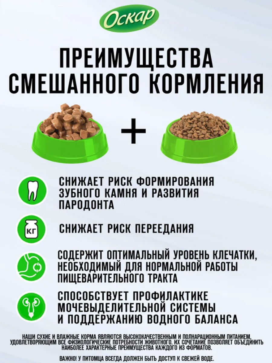 Ежедневное присутствие корма ОСКАР в рационе животного сохранит здоровье, укрепит иммунитет и поддержит хорошее настроение на долгое время.