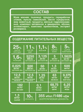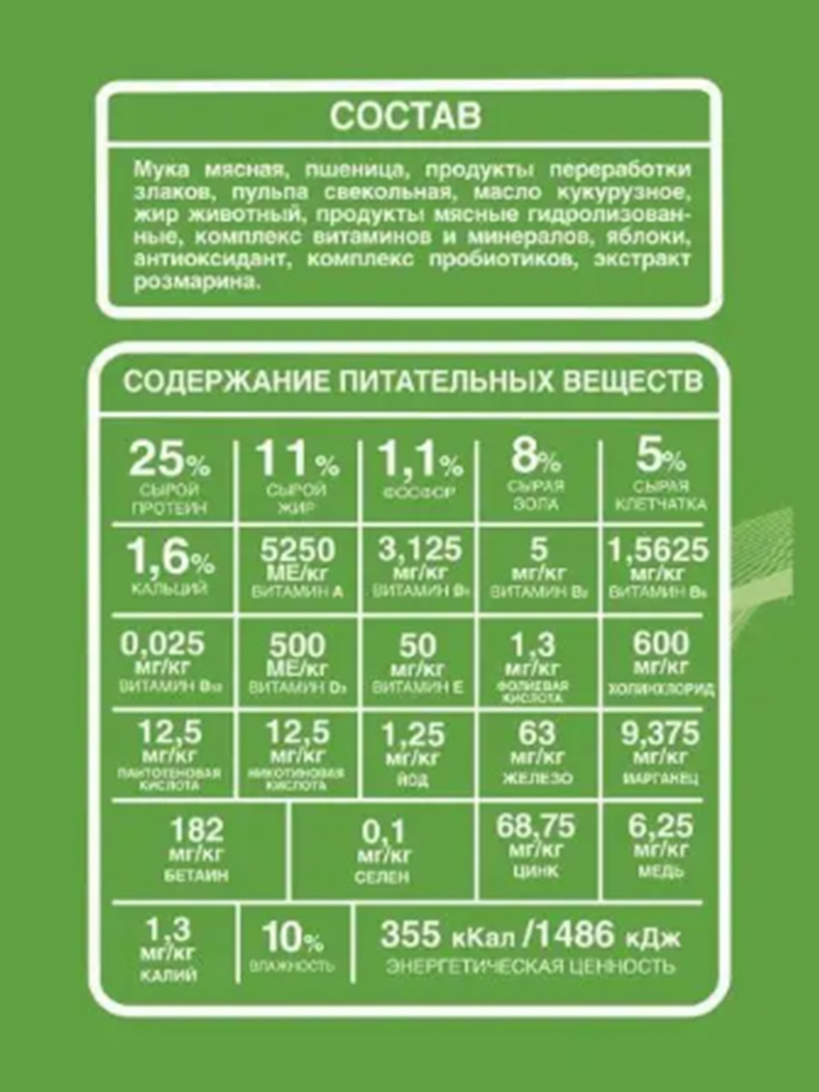 Протеины, содержащиеся в корме, легко усваиваются, содержат большое количество жизненно важных аминокислот, снабжают энергией, необходимой для роста мышц и тканей.
