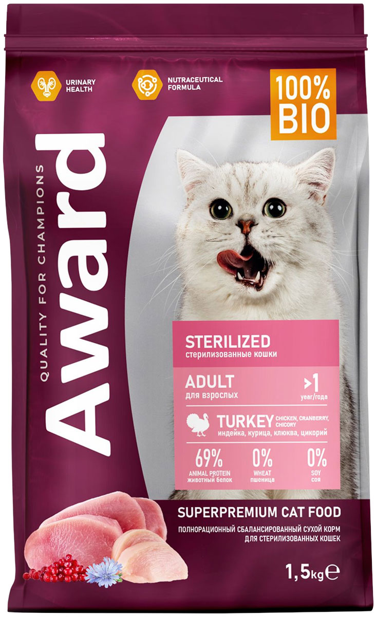 Сухой корм для стерилизованных кошек AWARD STERILIZED индейка, курица (1,5 кг)