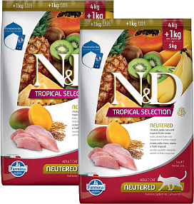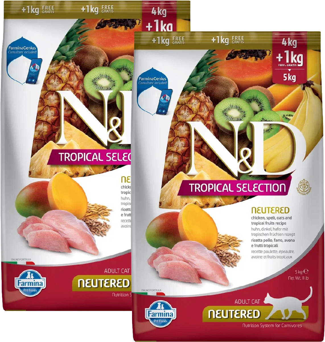 Сухой корм для стерилизованных кошек FARMINA N&D TROPICAL SELECTION NEUTERED CHICKEN низкозерновой курица, спельта, овес, тропические фрукты (5 + 5 кг)