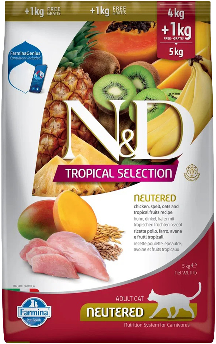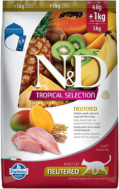Сухой корм для стерилизованных кошек FARMINA N&D TROPICAL SELECTION NEUTERED CHICKEN низкозерновой курица, спельта, овес, тропические фрукты (5 кг)