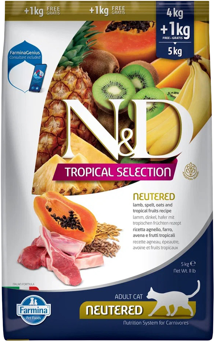 Сухой корм для стерилизованных кошек FARMINA N&D TROPICAL SELECTION NEUTERED LAMB низкозерновой ягненок, спельта, овес, тропические фрукты (5 кг)