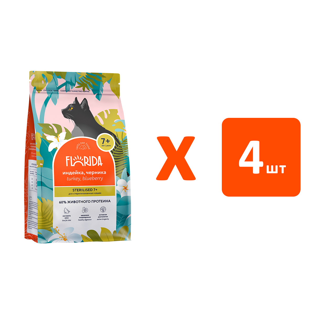 Сухой корм для взрослых кастрированных котов и стерилизованных кошек FLORIDA индейка, черника (1,5 кг х 4 шт)