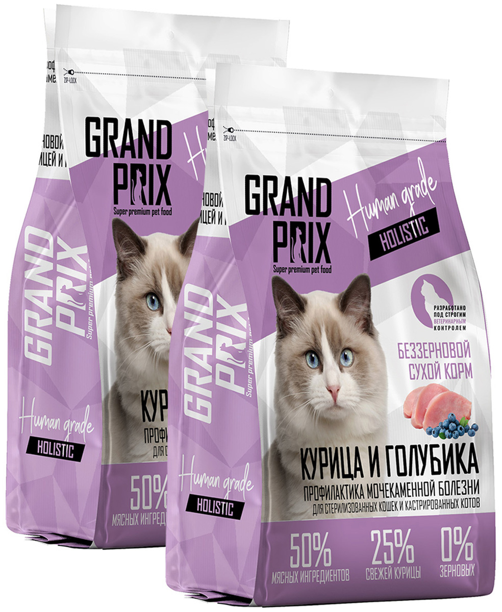Сухой корм для взрослых кастрированных котов и стерилизованных кошек GRAND PRIX HOLISTIC беззерновой для профилактики мочекаменной болезни курица, голубика (1,5 + 1,5 кг)