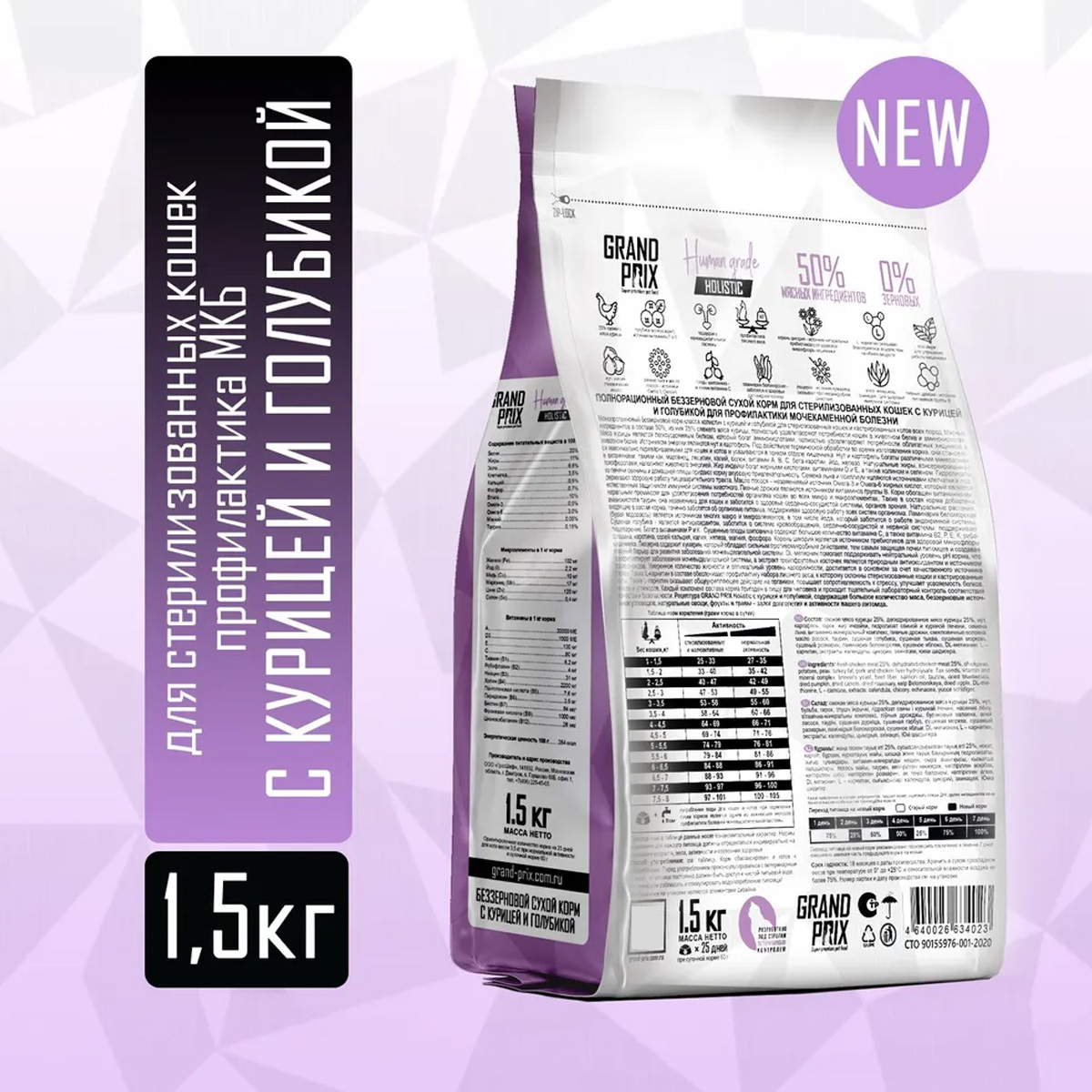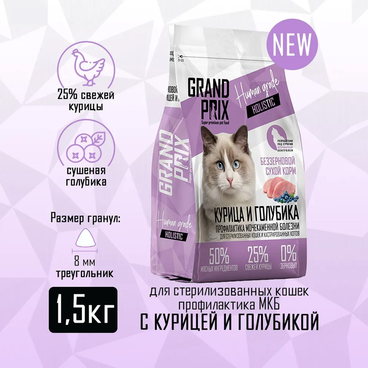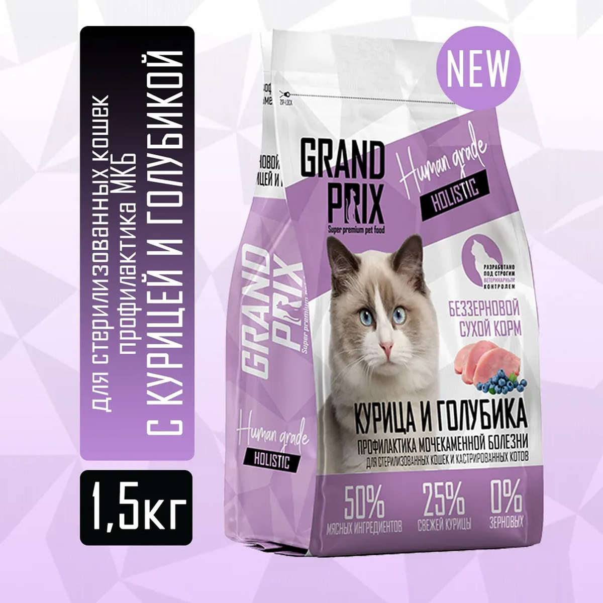 Сухой корм для взрослых кастрированных котов и стерилизованных кошек GRAND PRIX HOLISTIC беззерновой для профилактики мочекаменной болезни курица, голубика (1,5 кг)