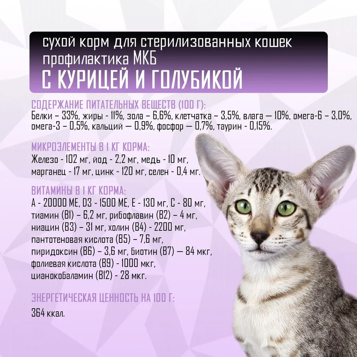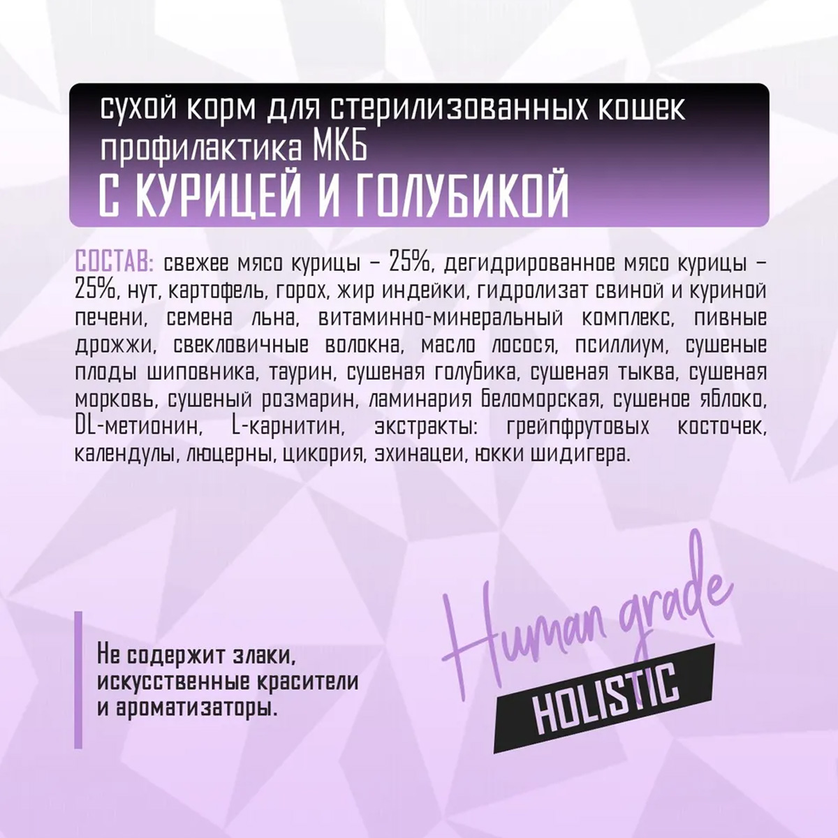 Монопротеиновый беззерновой корм класса «холистик» с курицей и голубикой для стерилизованных кошек и кастрированных котов всех пород.