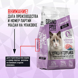 GRAND PRIX — корм для собак и кошек высшей категории качества. 50 % мясных ингредиентов в составе, из них 25 % свежего мяса курицы, полностью удовлетворяют потребности облигатных хищников в животном белке и аминокислотах. Источником энергии являются нут и картофель. Нут и картофель богаты различными минералами и витаминами, такими как марганец, лецитин, калий, селен, витамины А, В, С, бета-каротин, йод, железо.