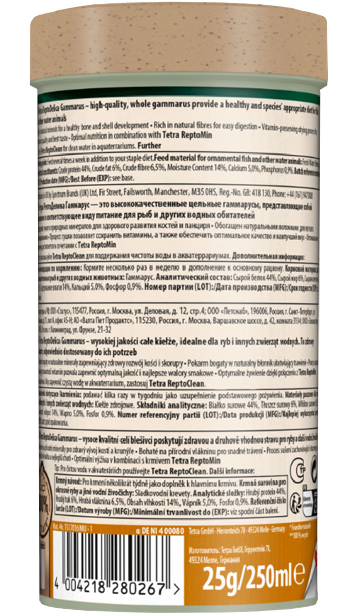 Это не только питательный корм, он наиболее приближен к тому естественному питанию черепах на воле. Tetra Gammarus для водных черепах содержит гаммарус – рачок, обитающий во многих водоемах. Этот рачок является важной составляющей кормового рациона водяных и сухопутных черепах. Содержит высокую питательную ценность и большое количества каротина. Благодаря правильному выбору корма ваша черепашка будет отличаться превосходным здоровьем и адекватным поведением.