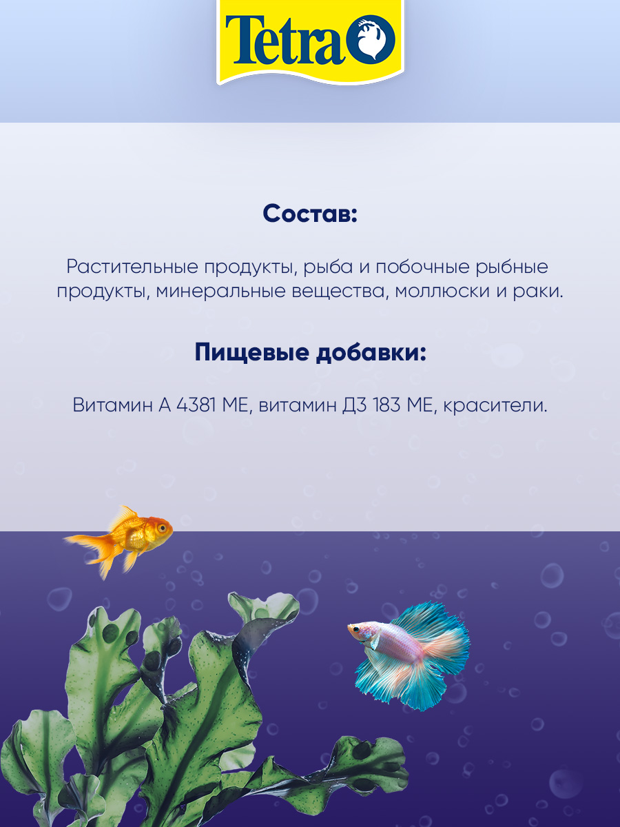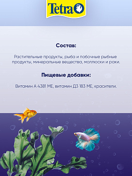 Состав: растительные продукты, рыба и побочные рыбные продукты, минеральные вещества, моллюски и раки.