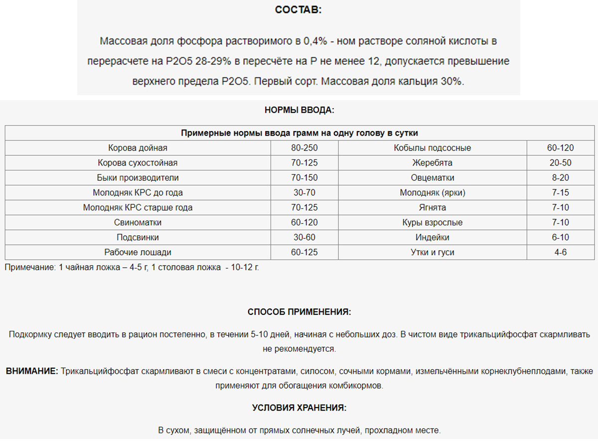 ВНИМАНИЕ: трикальцийфосфат скармливают в смеси с концентратами, силосом, сочными кормами, измельчёнными корнеклубнеплодами, также применяют для обогащения комбикормов.