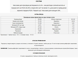 Массовая доля фосфора растворимого в 0,4 % - ном растворе соляной кислоты в перерасчете на Р2О5 28-29 % в пересчёте на Р не менее 12, допускается превышение верхнего предела Р2О5. Первый сорт. Массовая доля кальция 30 %.