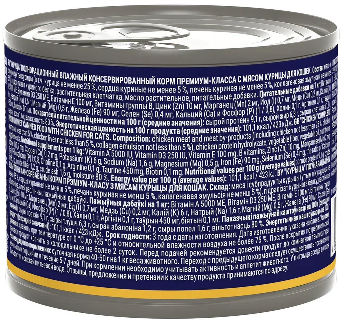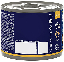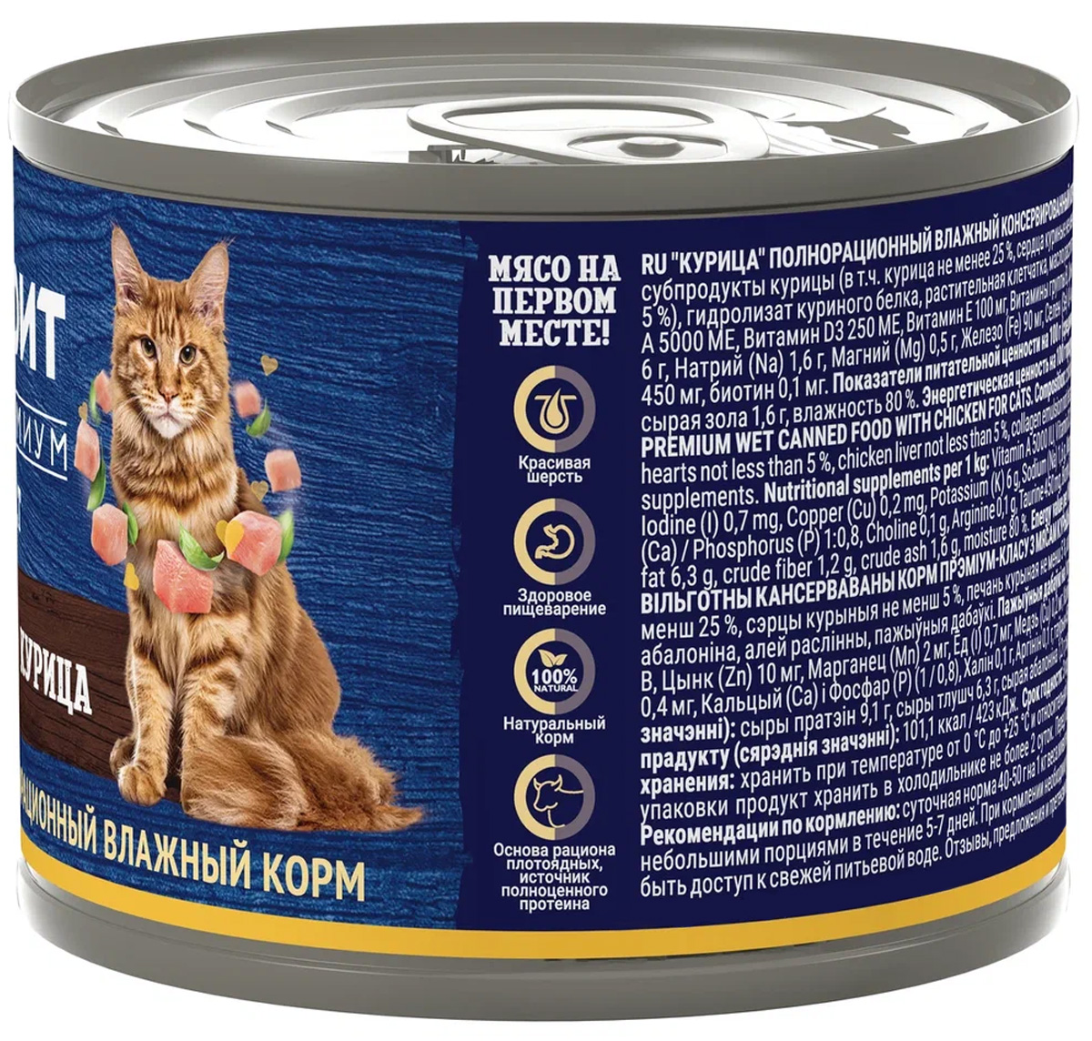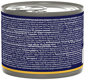 Мясо и субпродукты курицы (в т.ч. курица не менее 25 %, сердца куриные не менее 5 %, печень куриная не менее 5 %, коллагеновая эмульсия не менее 5 %), гидролизат куриного белка, клетчатка, масло растительное, витамины группы B, РР, K, Na, Mg, Fe, Cu, I, Se, Са и Р (1 / 0,8).