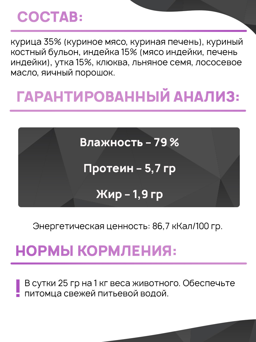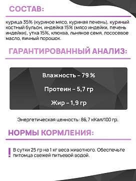 Состав: курица 35% (куриное мясо, куриная печень), куриный костный бульон, индейка 15% (мясо индейки, печень индейки), утка 15%, клюква, льняное семя, лососевое масло, яичный порошок.
