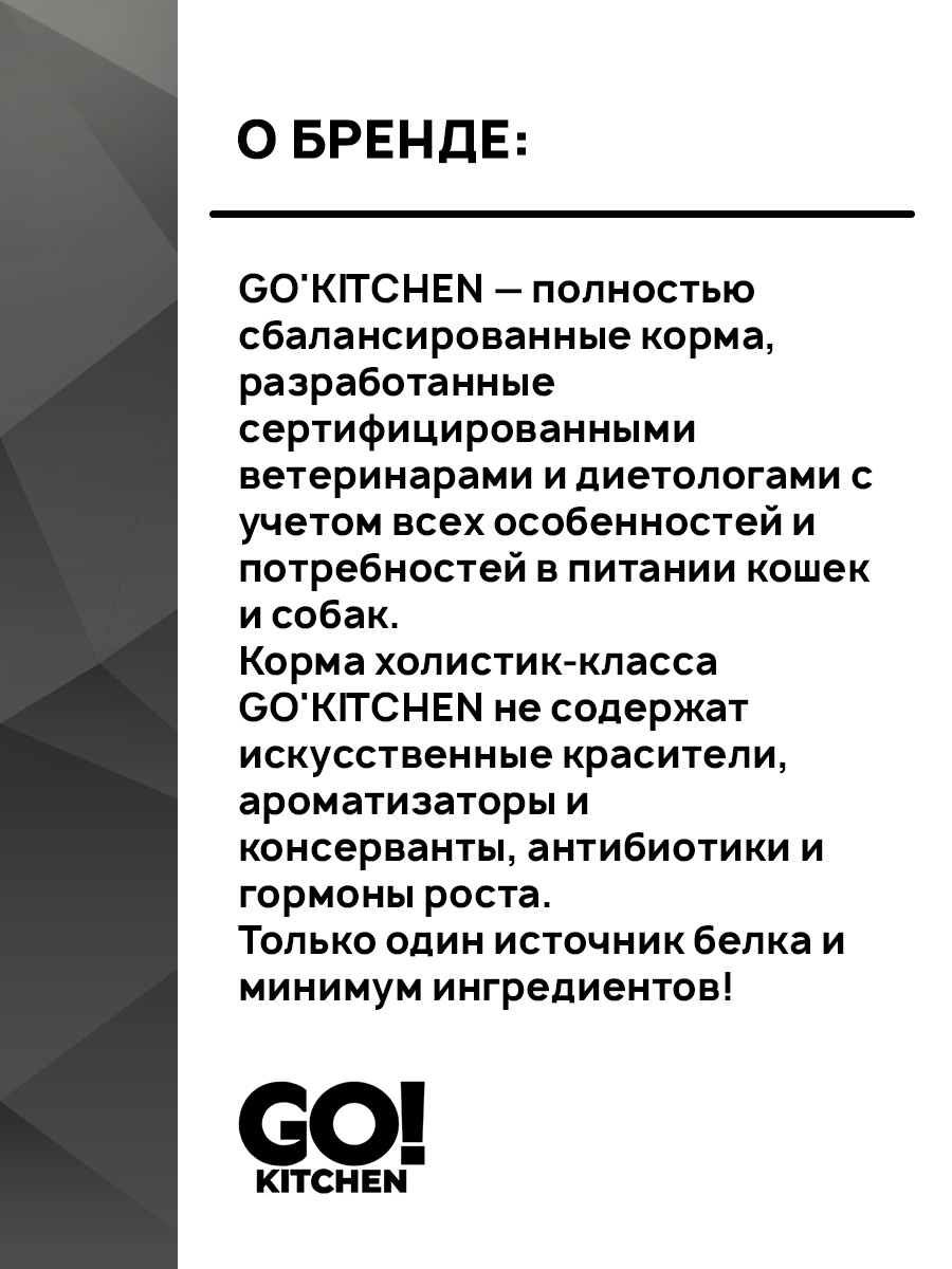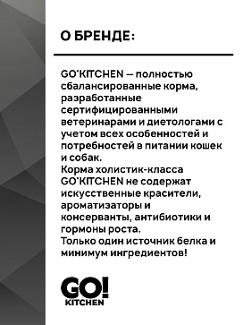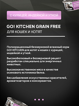 Полнорационный беззерновой влажный корм GO! KITCHEN для котят и кошек с курицей, индейкой и уткой.