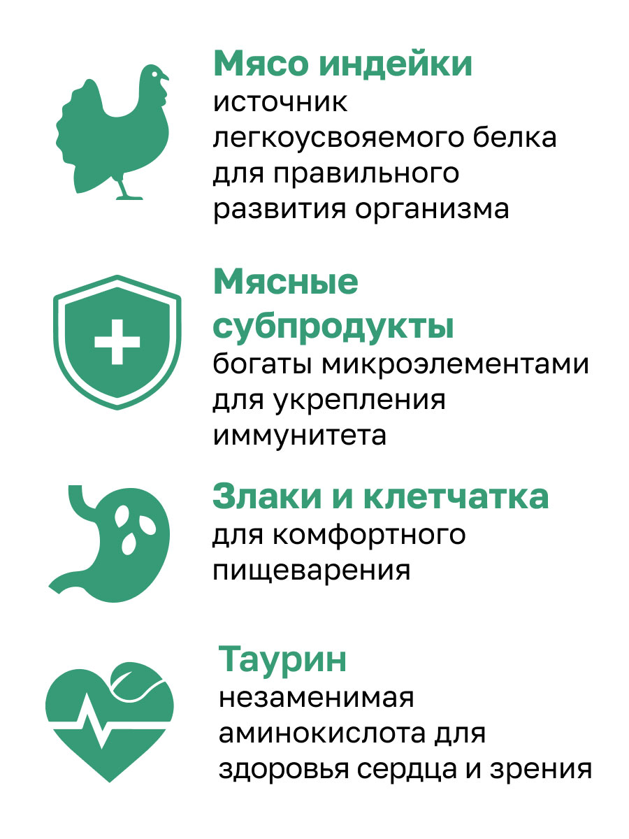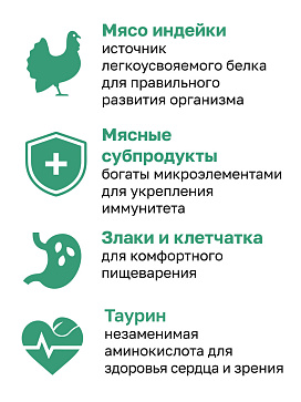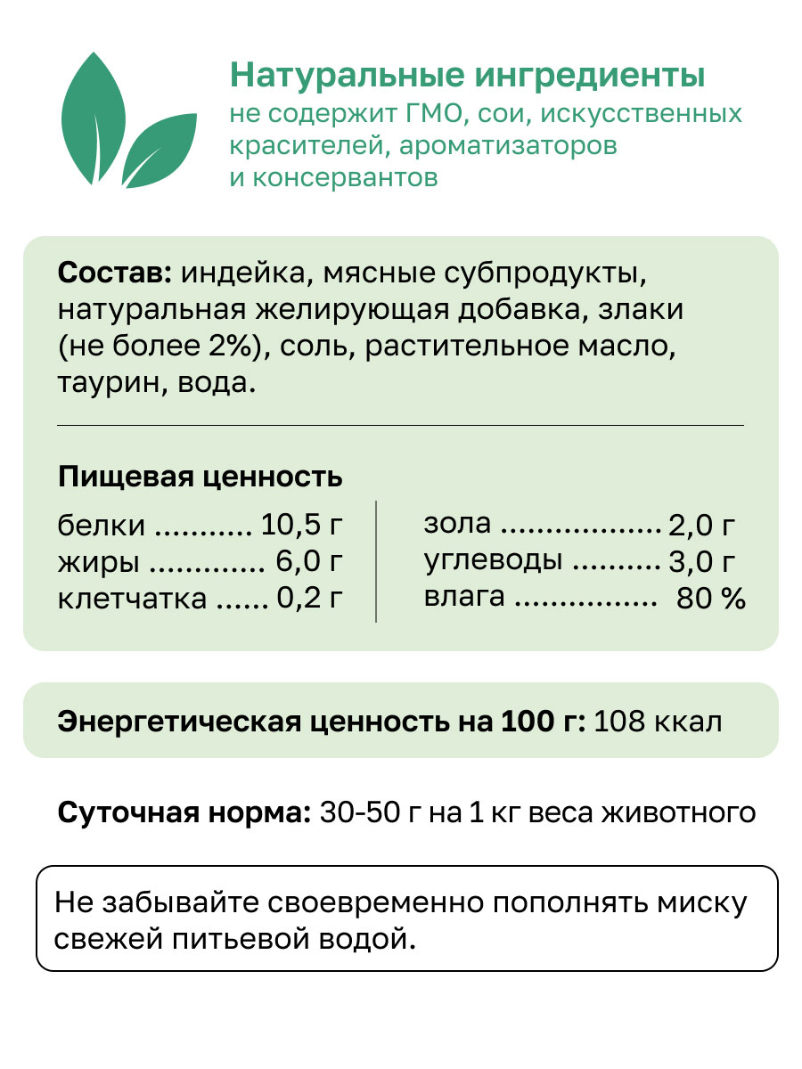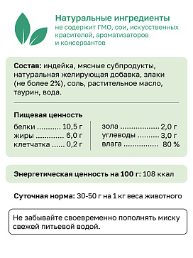 Индейка, печень, сердце, натуральная желирующая добавка, злаки (не более 2 %), соль, растительное масло, вода.