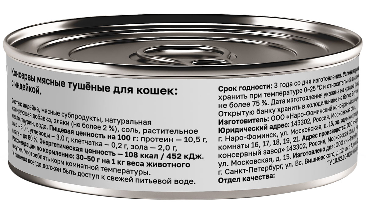 Мясные консервы для взрослых кошек с индейкой.• Вкусный консервированный корм для кошек. Изготовлен из 100 % свежего мяса различного вида.