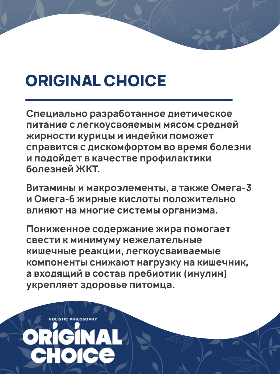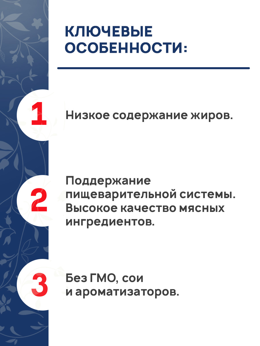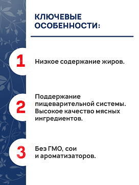 Пониженное содержание жира помогает свести к минимуму нежелательные кишечные реакции, легкоусваиваемые компоненты снижают нагрузку на кишечник, а входящий в состав пребиотик (инулин) укрепляет здоровье питомца.